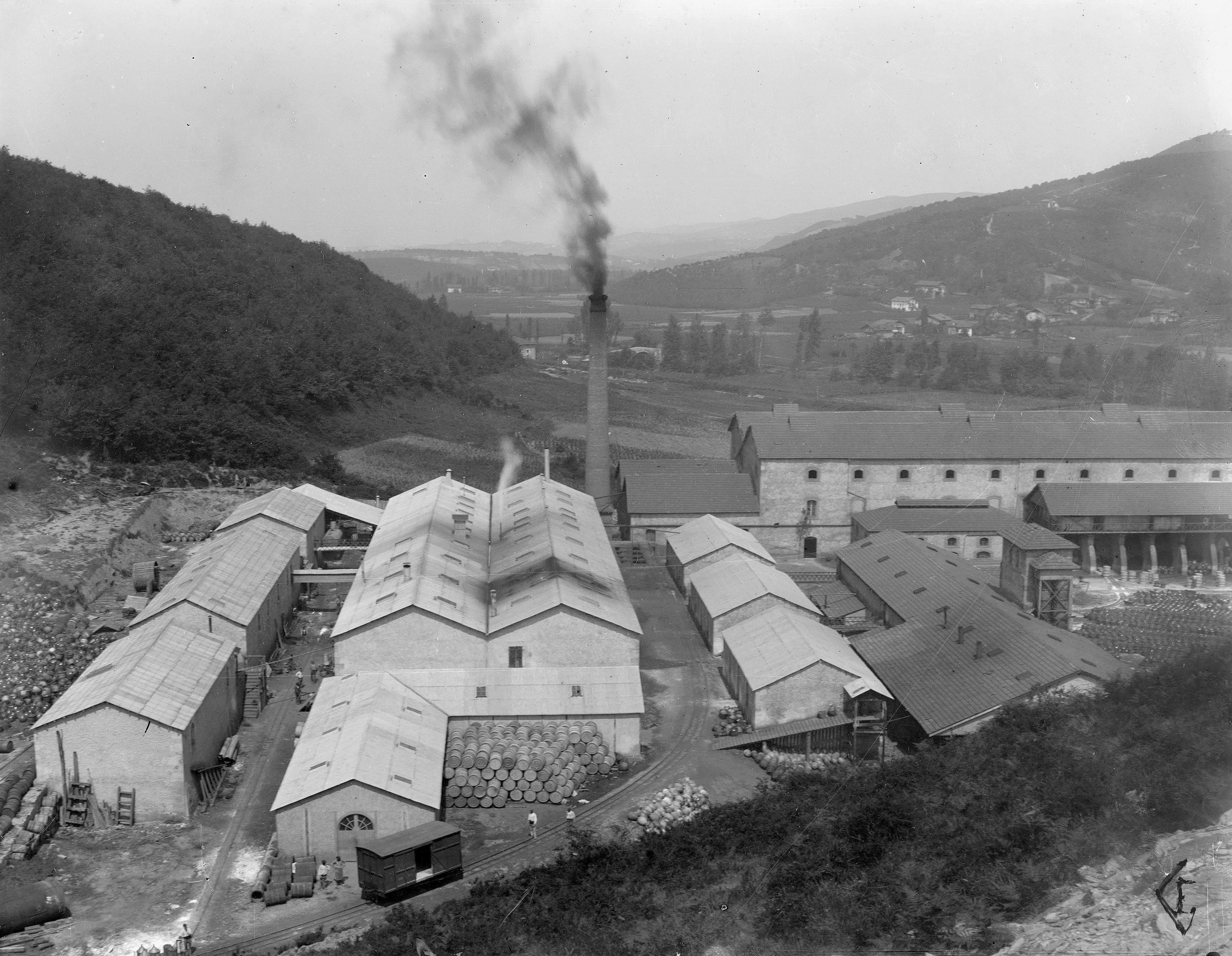 1880 - 1895 Vista parcial de la instalaciones fabriles de la Sociedad Española de la Dinamita. - Según dossier de UEE (Reg. Entrada 2167, 20-04-2006), el tendido ferroviario es del Ferrocarril Central de Vizcaya, en torno a 1890.