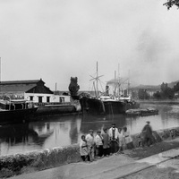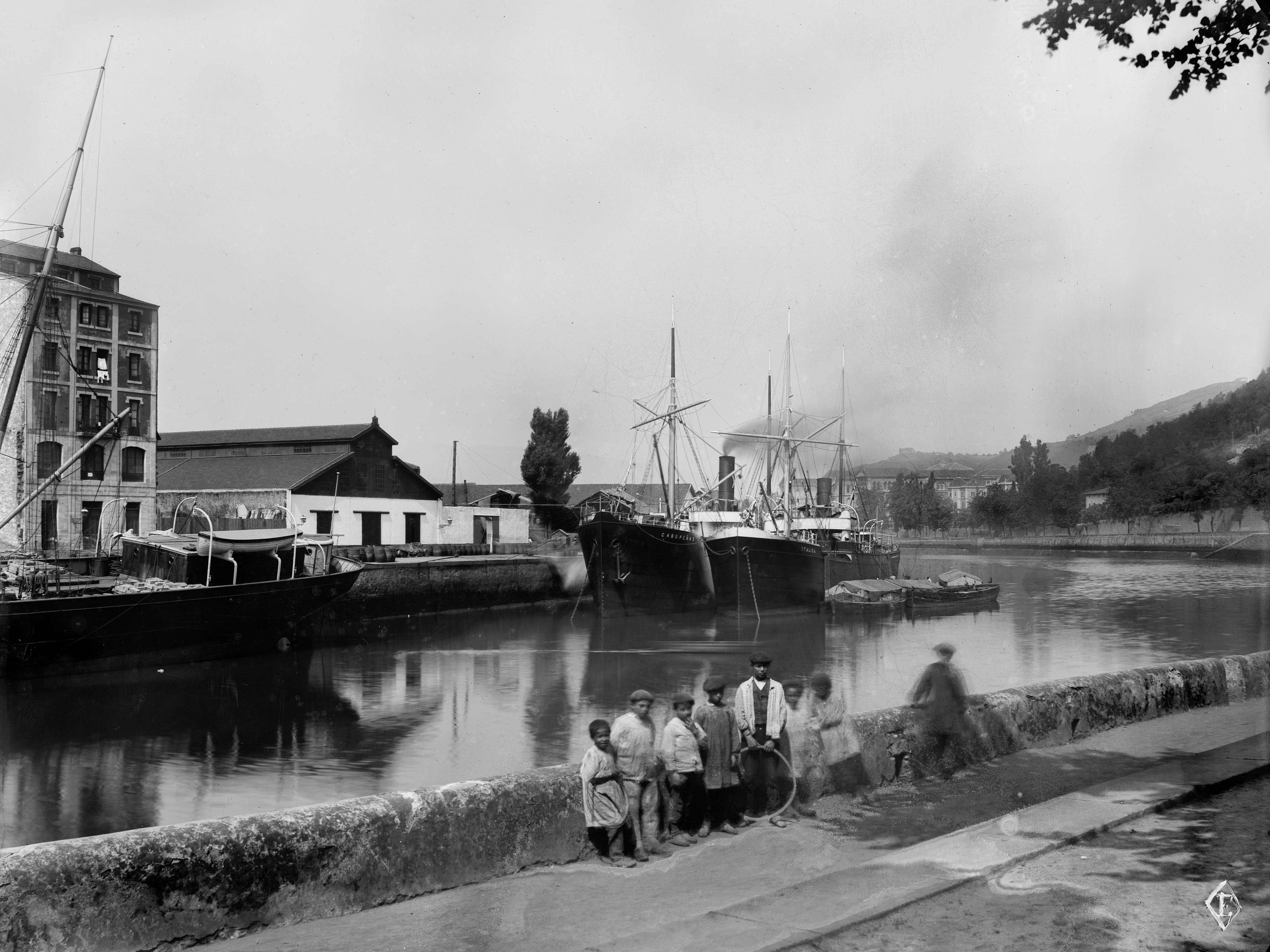 Circa 1888 Vista de parte del muelle tomada desde Campo Volantin en cuyo pretil posan varios niños, uno con aro, en lo que se conocía como "camino de sirga". En el muelle, pasada la grua grande, esta parte se conocía como "muelle de La Vasca" por atracar alli los buques de la Naviera Vasco-Andaluza, absorbida en 1888 por la Neviera Ybarra y Cia. que traficaba con coloniales procedentes de Santander. Amarrados al muelle, los vapores "ITALICA" y "CABO PEÑAS" junto a instalación portuaria que creemos pudiera ser La Compañía de Maderas o La Compañia Arana. Al fondo la univesidad de Deusto, inaugurada en 1886.