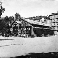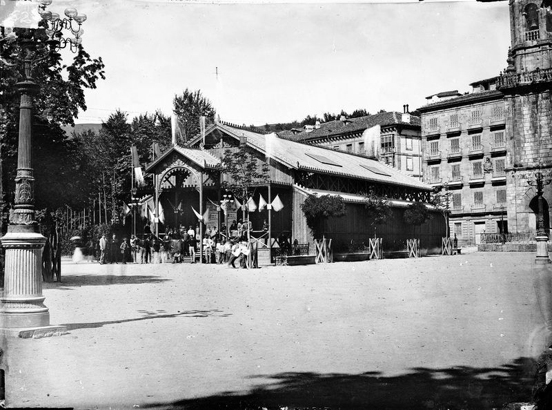 c. 1880 Vista general del pabellón montado a beneficio de la Santa Casa de Misericordia en El Arenal junto al palacio Gomez de la Torre, obra de 1790. Se trata de una tómbola.