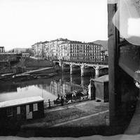 Antes de 1874 Vista tomada desde el muelle de Arriaga, mostrando la calle Navarra. El puente de Isabel II, hecho en Santa Ana de Bolueta y deteriorado durante la II Carlistada, se nos muestra sin las torretas que albergaban el mecanismo para elevarlo y con algunos de sus los arcos con puntales de madera, a partir de entonces tan solo las gabarras circularán aguas arriba. Todavia no se ha construido la estación para el ferrocarril a Portugalete.