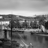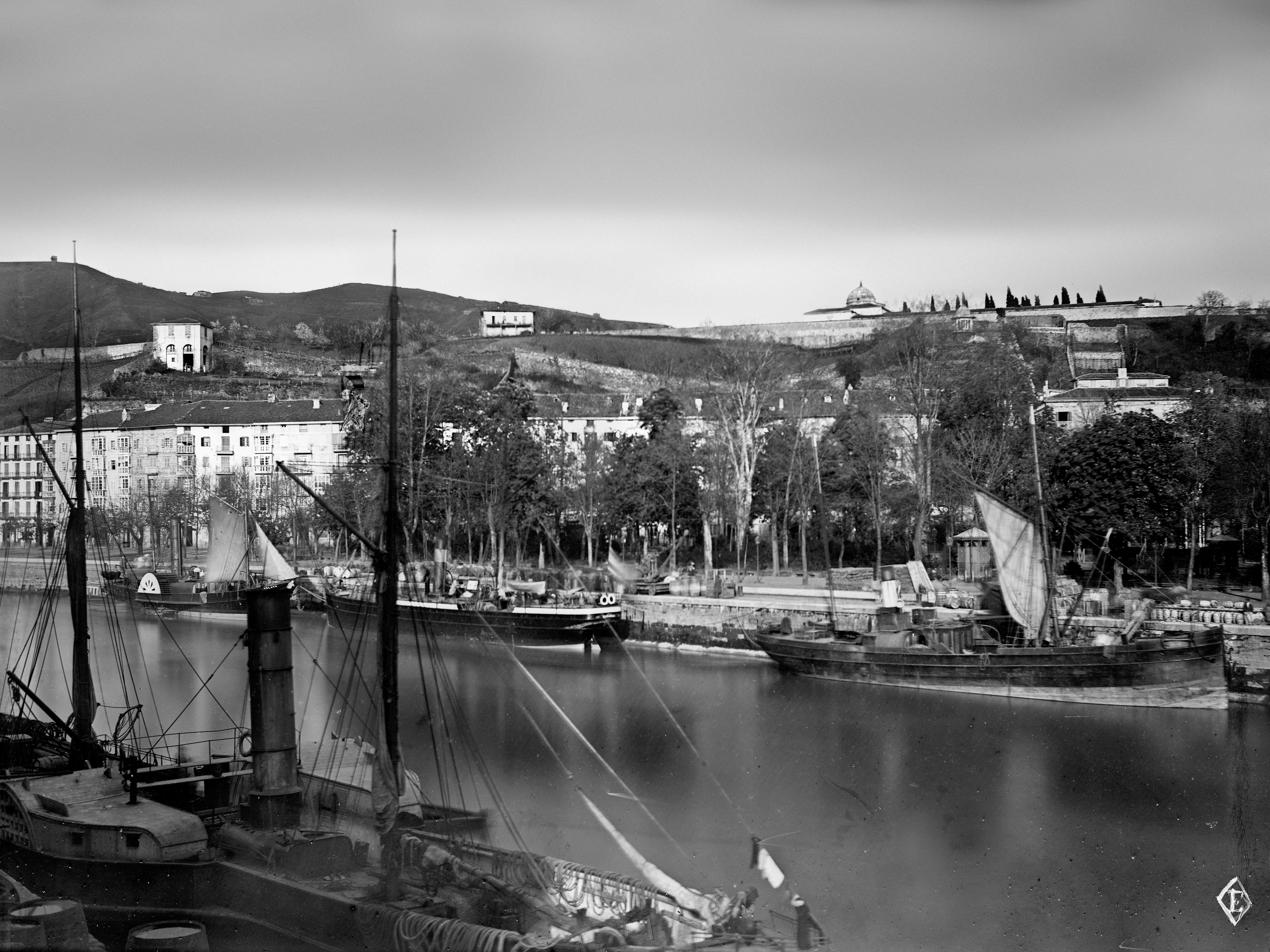 c. 1885 Vista tomada desde el muelle de Ripa mostrando los veleros y vapores amarrados en el muelle del Arenal. Destacar las embarcaciones amarradas que, combinando vela y vapor, están dotadas de rueda de tambor en la parte central del barco, como el "PELAYO". Eran las encargadas del servicio postal, del tráfico regular de mercancias con Santander y de pasajeros con el Abra, asi como de algunas faenas de remolque.