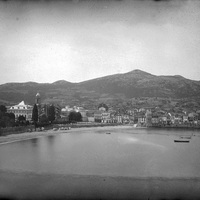 1880 - 1895 Vista general de la villa marinera donde todavía no se ha construido "fraileen mollia". A la izquierda la iglesia y el palacio Iribarren donde se refugió la emperatriz Zita de Hausburgo.
