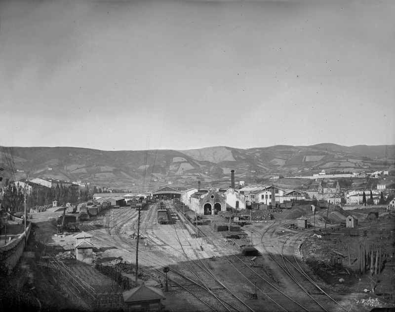 1875 Vista de la primitiva estación desde el actual puente de Cantalojas. Los terrenos en que se levantó eran del linaje de los Basurto. Fue inaugurada la línea hasta Miranda de Ebro en Abril de 1863 y hasta Tudela en Agosto del mismo año. A la izquierda, se aprecia la actual calle Hurtado de Amezaga, entonces calle de la Estación y a la derecha, el teatro y San Nicolás.
