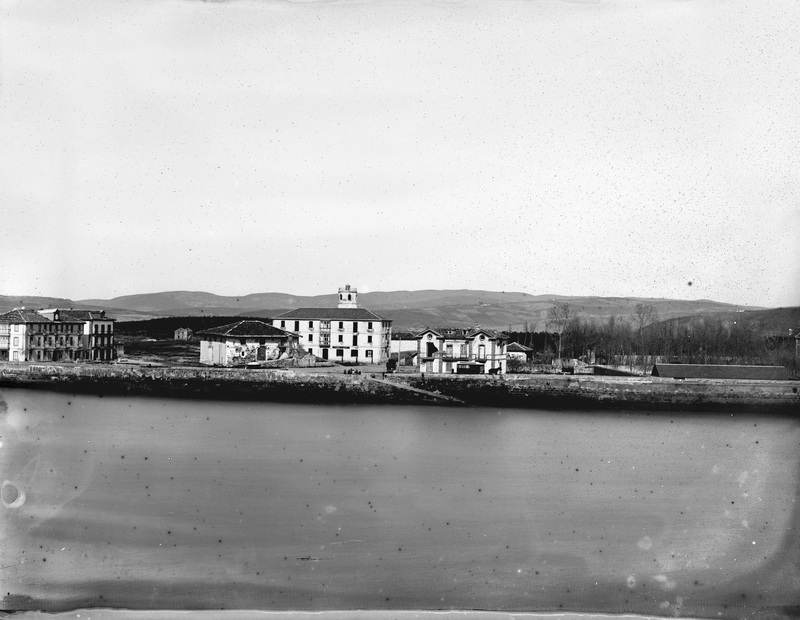 Antes de 1890. Vista tomada desde Portugalete mostrando la margen derecha con varias edificaciones y la fonda reseñada. Según el portugalujo Jose Antonio Soto, es el lugar donde se construyó el puente de Vizcaya, el puent colgante.