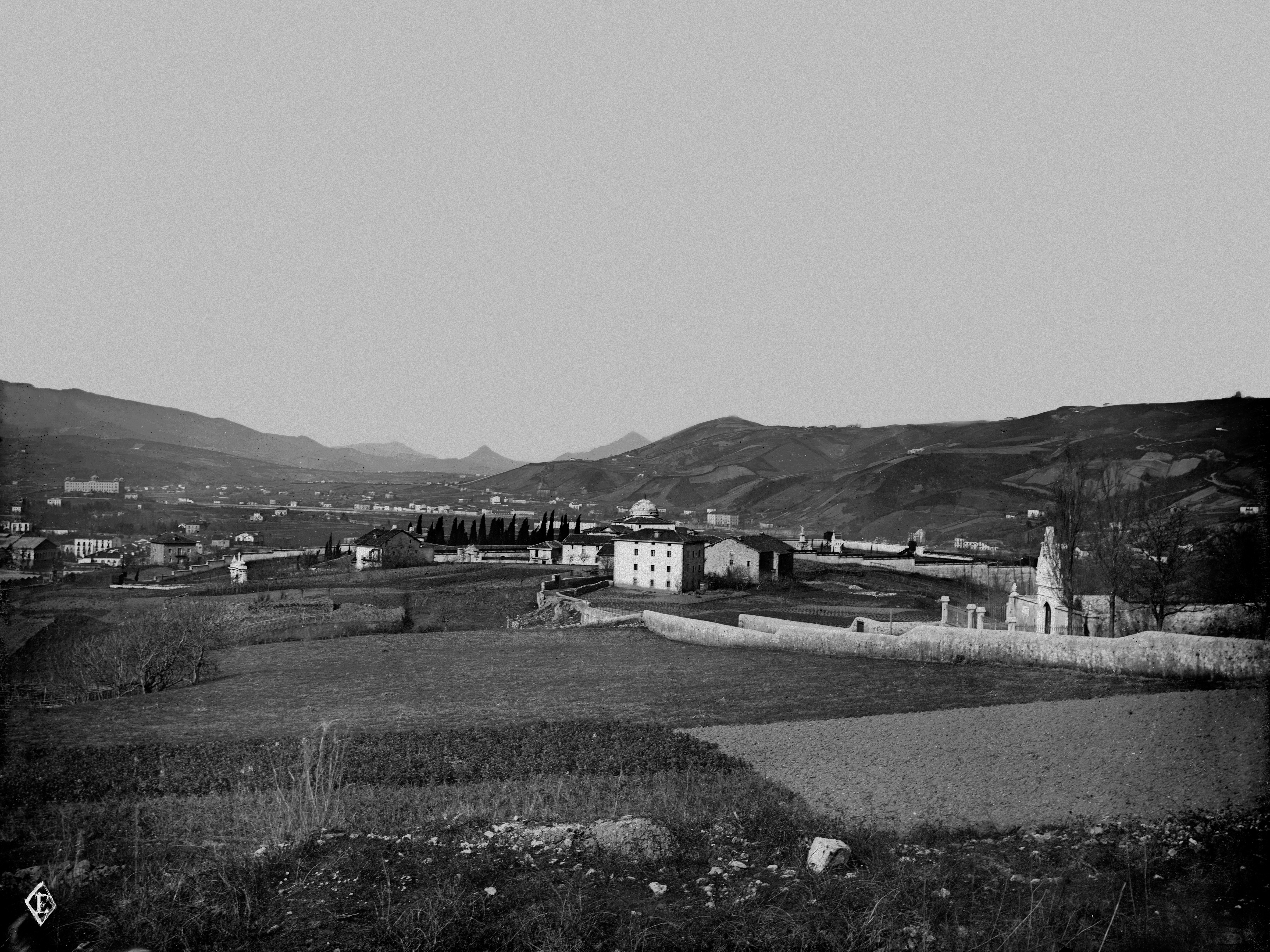 c. 1872. Vista general de los alrededores del cementerio de la Anteiglesia de Begoña, al pie de las calzadas, claramente delimitadas por petril a ambos lados. Destaca la puerta de acceso al cementerio, que hoy dia se conserva. Al fondo el cementerio de Mallona, construido en el alto del mismo nombre, finalizado en 1930. Casi en el horizonte, la Santa Casa de Misericordia, en San Mames, inaugurada en 1872.
