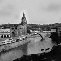 c. 1865 Vista general tomada desde Marzana donde aparece el viejo puente de San Antón, la iglesia y adosado a ésta el ayuntamiento que se demolerá en 1895. En la plaza vieja, alineación de los puestos del mercado. Al fondo, portada de la iglesia de la Encarnación y el paisaje rural de Santutxu.