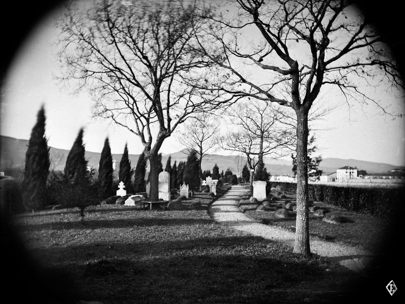 c. 1875 Vista del interior del cementerio protestante situado en la vega de Abando, acotado por concesión gubernativa en 1869, propiedad del Consulado Británico. Dejó de utilizarse para este servico por R.O. de 1907 y en 1927 los restos fueron exhumados y trasladados a Lujua, donde reposan actualmente, esta operación se realizó por las reiteradas peticiones de l Junta de Obras del Puerto a fin de dar continuidad a los muelles de la margen izquierda. Posteriormente esta zona se denominó "Campa de los Ingleses", fue campo de futbol y lugar donde se colocaba el circo.