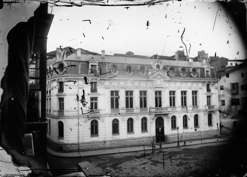 1880 - 1895 Vista de la fachada principal del Banco Bilbao en la plaza de San Nicolas. Este edificio fue la segunda sede de esta institución creada en 1857 con sede en la calle La Estufa nº 7. La primera piedra del edificio que vemos se colocó en marzo de 1865 y se inauguró el primero de enero de 1868 siendo proyecto del arquitecto Lavalle (segun Bilbio. 1)