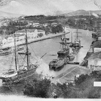 - ES c. 1875 Reproducción fotográfica de una lámina o quiza fotografía donde aparece Olabeaga con diveros veleros en el cauce de la ria.