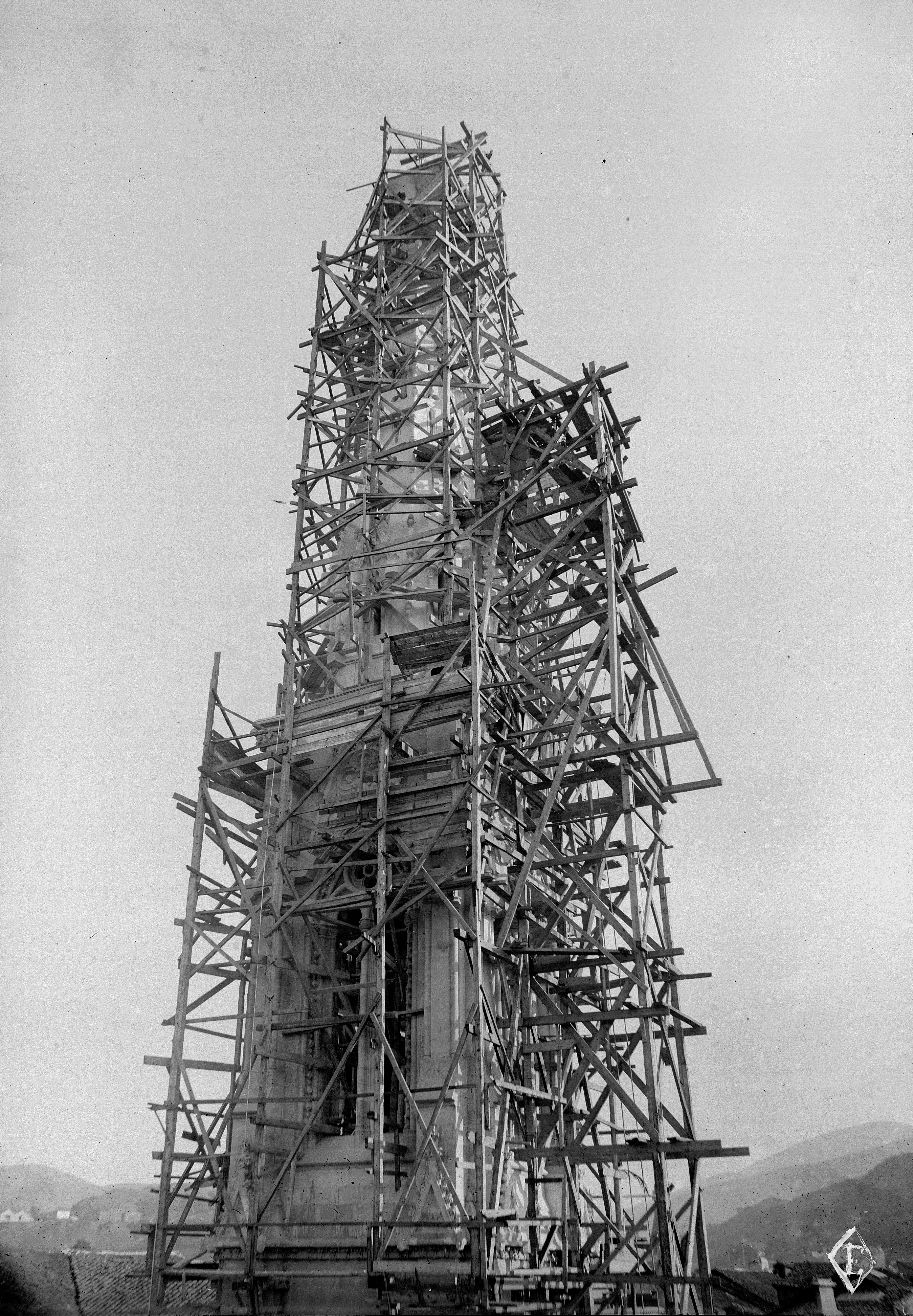 Antes de 1890 Vista parcial de la nueva torre de la catedral de Santiago mostrando el andamiaje de madera durante su construcción. Fue obra de Severino Churruca, inaugurada en 1890.