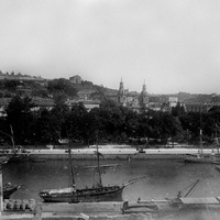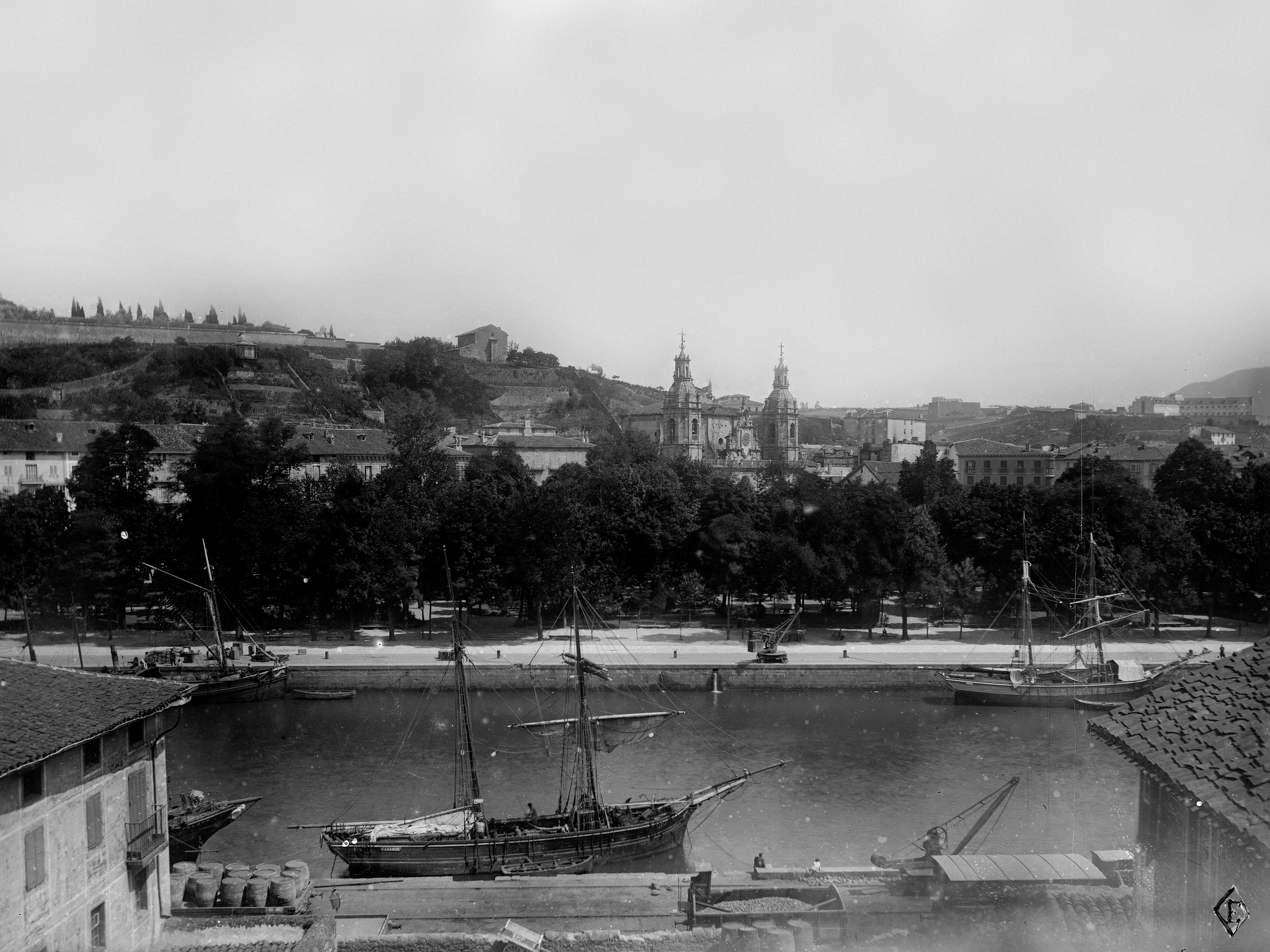 c. 1880 Vista tomada desde el muelle de Ripa donde vemos atracado el paquebote "CAZADOR" de 180 toneladas, propiedad de Juan de Villavaso. Tras el muelle del Arenal, el paseo del mismo nombre que, segun nos cuentan, poseía por entonces cerca de 300 árboles, robles, tilos, castaños de indias, plátanos y acacias, formando seis espaciosas calles con bancos de respaldo de hierro, tres jardines cultivados y tres estanques con peces, plantas acuáticas y juegos de agua. En Mallona destaca el cementerio a la derecha y el perfil del caserío Lurbarrieta, desaparecido en torno a 1990, cuyos propietarios en 1849 eran Ubedia y Basurto, administrador Bruno de la Infanta e inquilino Gregorio Arana. En 1875 el propietario era Manuel de Taramona.