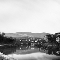Antes de 1878 Vista tomada desde el final el muelle del Arenal mostrando ese muelle con cañones a modo de norays de amarre, el puente y Ripa en cuya margen se agolpan las gabarras.