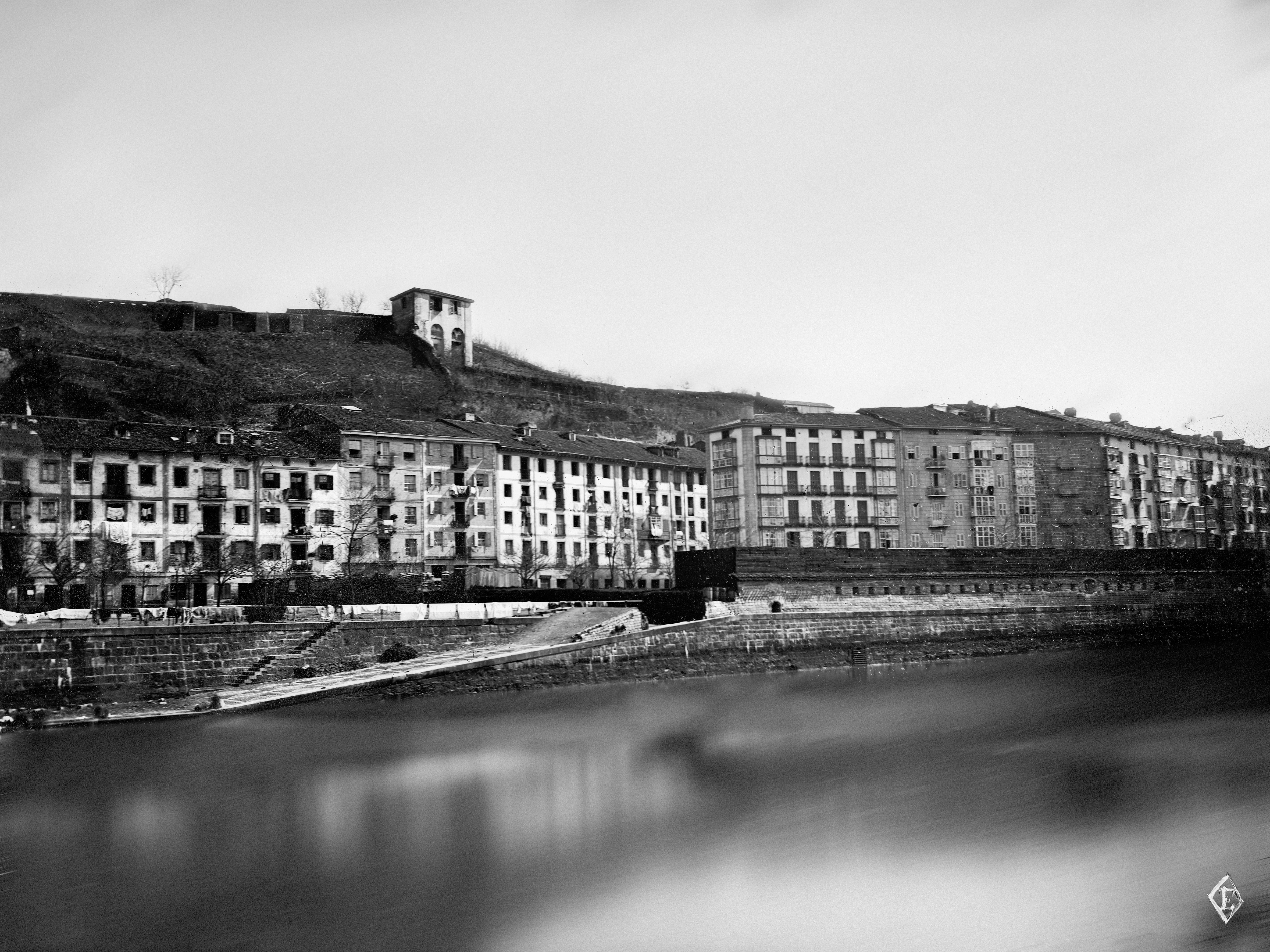 c. 1874 Vista tomada desde el muelle de Ripa mostrando el final de la calle de la Estufa, hoy Vda. de Epalza, y los primeros números de la calle Sendeja, cuyas casas de la izquierda desaparecerán pronto para construirse las casas de Manuel Taramona. En el borde del muelle, las instalaciones militares de la denominada "Bateria de la Muerte", utilizadas en la defensa de la villa durante la II Guerra Carlista.