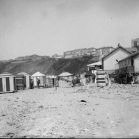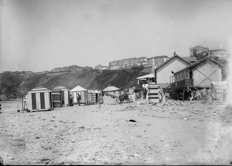 c. 1890 Vista donde aparecen las casetas sobre la arena y, junto a éstas, la casa de baños "La Perla" donde habia una bomba para subir a un depósito el agua salada, estuvo en funcionamiento desde 1887 hasta 1912 y era de Antonio Aretxabaleta.