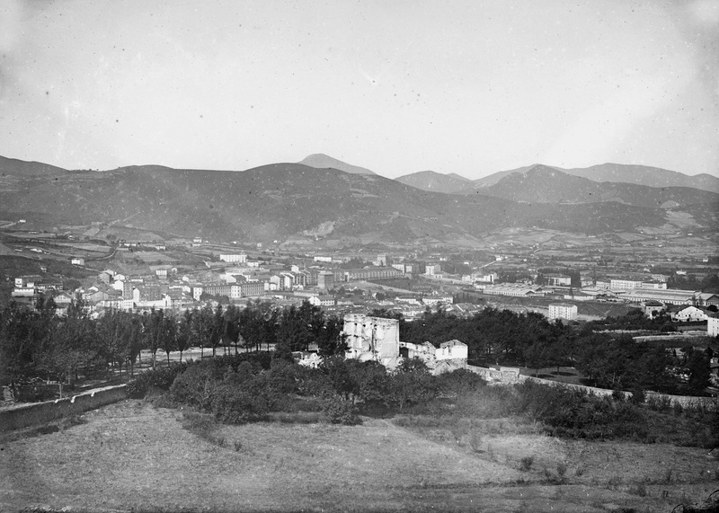 - ES c. 1874 Vista general desde Begoña mostrando en primer término una casa en ruinas consecuencia de la II carlistada. Al fondo Bilbao.