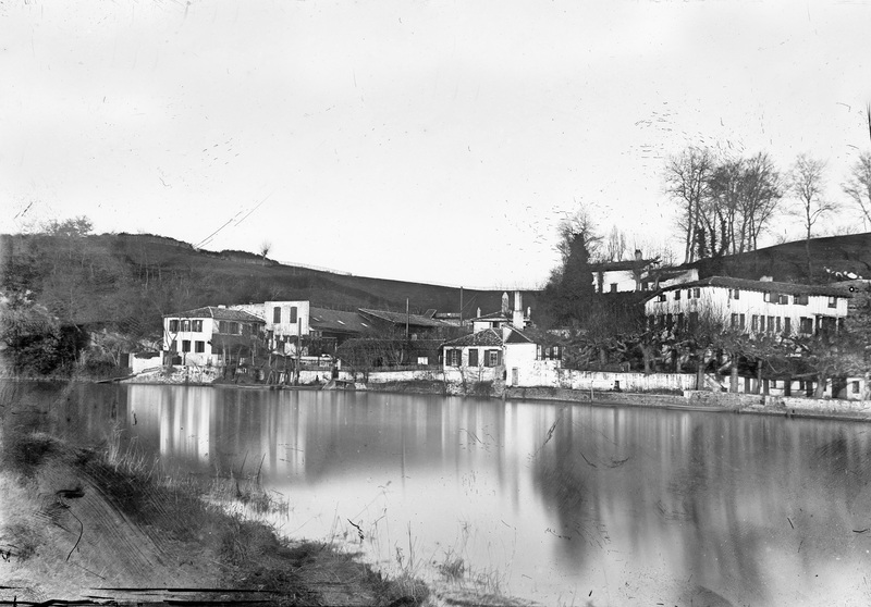 - ES 1880 - 1895 Vista de un rio con casas en la orilla.