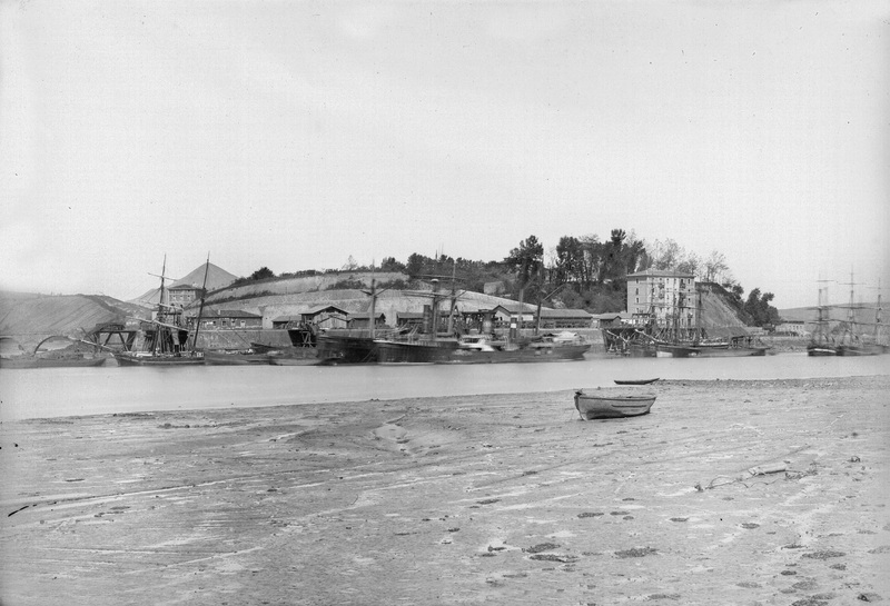 1880 - 1895 Vista de la ría, donde actualmente esta la Sociedad Kaiku, con gabarras, veleros y vapores atracados en los cargaderos de mineral del Ferrocarril de Triano, obra de la Diputación. Casa con cartel (GEFE DEL XXXX DE LA 3ª SECCION). A la izquierda el puente sobre la desembocadura del río Galindo y a la derecha, la casa de pisos, quizá viviendas de los forales. Tras los árboles, el convento de los Carmelitas, primeros del mundo en regar sus huertas con agua salada. Al fondo, la cumbre del monte Serantes.