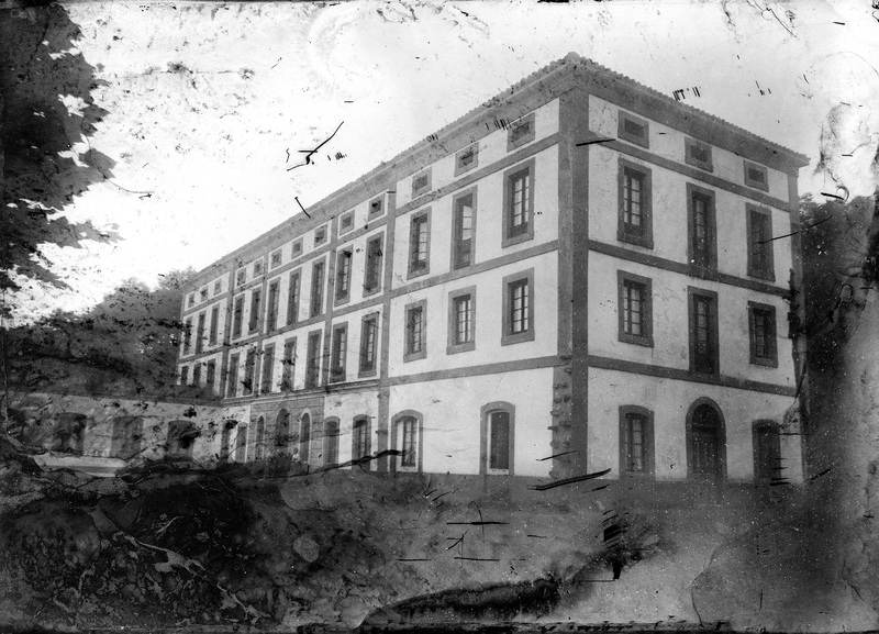 - ES 1880 - 1895 Vista de un edifico de cuatro alturas con ala adosada a la izquierda.