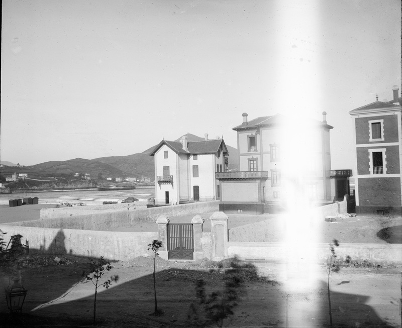 - ES 1880-1890 Vista de varios chalets al borde del Abra, en la playa de Las Arenas. - La casa de la izquierda, ver ERR-076. - Esta imagen es muy semejante a ERR-140
