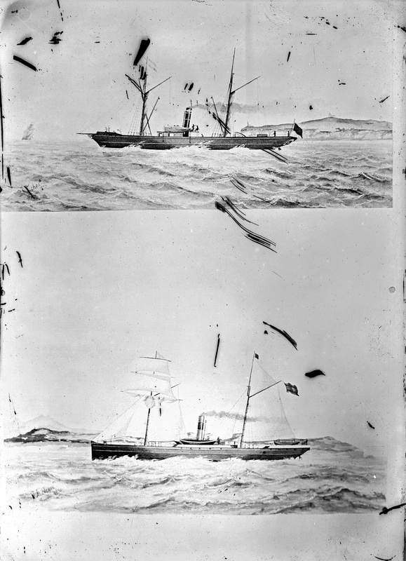 1880 - 1895 Reproducción fotográfica de una lámina donde aparece dos barcos a vapor navegando mostrando el lado de babor. Firmados J. Echen Bayona 1874