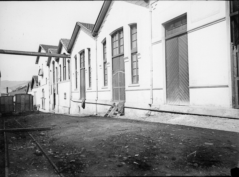 Vista de la instalación fabril de harina en Guturribai, con calle interior provista de railes para tren mostrándose unos vagones y al otro lado varios niños. Ver tambien ERR-257