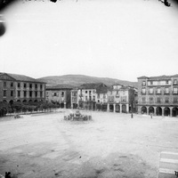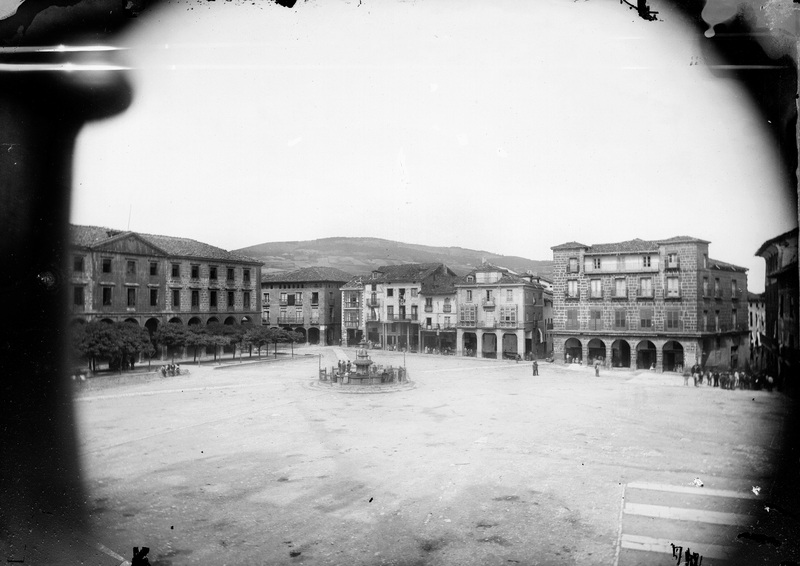 - ES 1880 - 1895 Vista general de la plaza de la ciudad del Orduña donde se aprecia en el centro la fuente pública y a la izquierda en edificio de La Aduana.