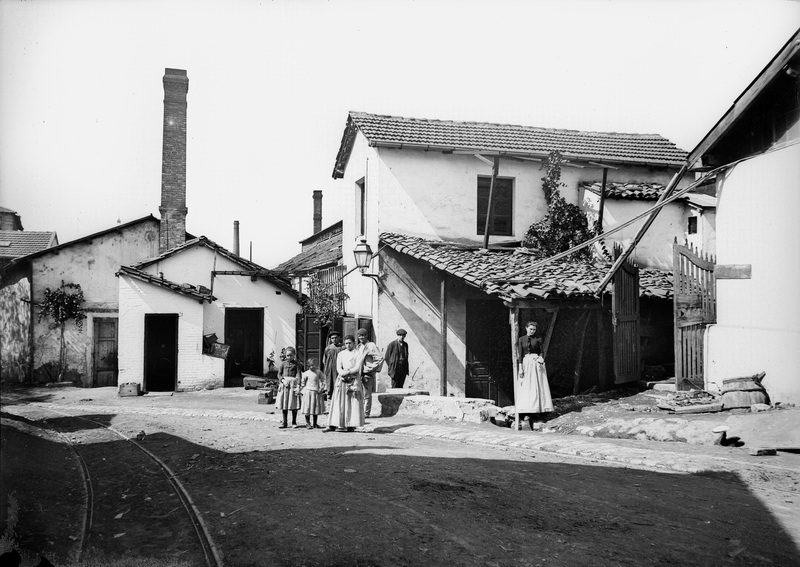 - ES 1880 - 1895 Vista de un grupo de casas, con familia posando en el centro, donde destaca una chimenea de ladrillo y las vias del tren.