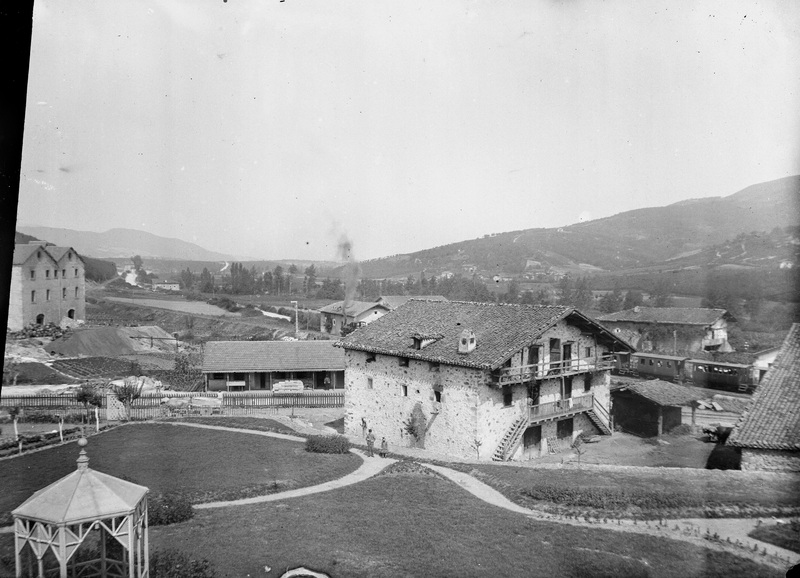 1880 - 1895 Vista parcial donde aparece en el centro un caserio con los alrededores urbanizados y una glorieta. Segun Tere Rotaetxe la familia Errazquin o Chalbaud tenia un chalet en Zuazo. Al fondo a la izquierda, las instalaciones de La Dinamita. - Según dossier de UEE (Reg. Entrada 2167, 20-04-2006), el tendido ferroviario es del Ferrocarril Central de Vizcaya, en torno a 1890.