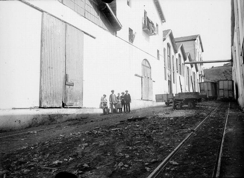 1890 Vista de la instalación fabril de harina en Guturribai, con calle interior provista de railes para tren mostrándose unos vagones y al otro lado varios niños. Ver también ERR-249