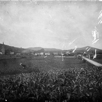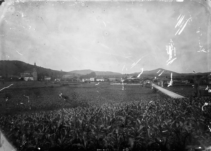 1880 - 1895 Vista general de Amorebieta-Etxano, con la carretera a la derecha, y la iglesia de Santa María de la Asunción a la izquierda.
