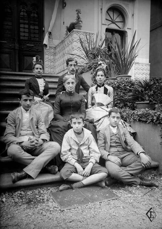 1880 - 1895 Grupo familiar sentado en las escaleras del acceso al chalet nº 37 (actual 34?) del Campo Volantín, identificados por Tere Rotaetxe y Begoña Chalbaud: 1- Jose Mª Chalbaud Errazquin, casado con Sofia Olaso. 2- María Chalbaud Errazquin, casada con Ramón Amann. 3- Pedro Chalbaud Errazquin, casado con Ines Amann. 4- Isabel Errazquin Astigarraga, Vda. de Facundo Chalbaud, madre de todos. 5- Vicenta Chalbaud Errazquin. 6- Manuel Chalbaud Errazquin, casado con Carmen Ibarra. 7- Luis Chalbaud Errazquin, nació en Baiona durante el exillio de la familia Chalbaud Errazquin. - Segun dossier de UEE (Reg. Entreda nº 2167, 20-04-2006) Isabel Errazquin, esposa de Facundo Chalbaud Cardona, delante, izda. dcha., Jose Maria, Manuel y Luis, arriba, izda. dcha., Maria, Pedro y Vicenta.