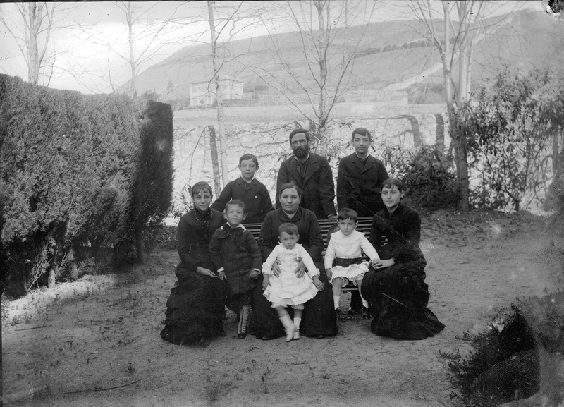 1880 - 1895 Grupo familiar sentado en banco de jardín. Según Begoña Chalboud, que no reconoce a nadie, podria tratarse de la finca de Deusto donde veraneaban los Chalbaud, cerca de Bidarte, entre la ría y la carretera, casa de Arbolantxa.