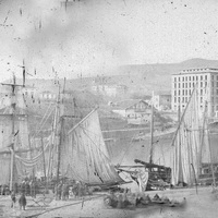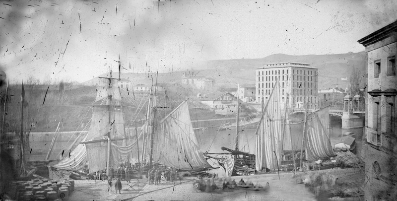 Anterior a 1860 Vista pictorialista tomada desde la calle Ribera, mostrando el muelle de Arriaga con veleros de alto porte y mercancías tras haber pasado el tramo central levadizo del puente de Isabel II, las torretas del mismo asi como su mecanismo levadizo fueron realizados en la fundición Santa Ana de Bolueta y, según Delmas, para 1864 ya se habían anulado por deterioro debido al intenso tráfico rodado tras la apertura de la estación de ferrocarril del Norte. En la orilla izquierda un Abando bucólico con caserío y huertas en la actual estación de FEVE y la casa Mazas, propiedad del empresario Pedro Mazas Torre que se inaugurará en 1860. Cierra la imagen la silueta de la iglesia de San Vicente. Es panorámica, P009, con ERR-269 a la izquierda.