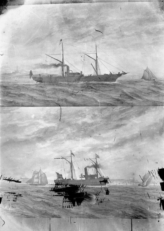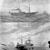 - ES Reproducción fotográfica de dos pinturas donde aparecen los perfiles de dos barcos navegando, ambos con mástiles y chimenea de vapor.