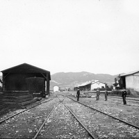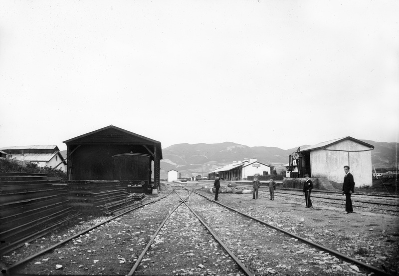 1880 - 1895 Vista general del entorno de la estación de ferrocarril a su paso por Orduña, segun conta en cartela de una de las construcciones de la derecha. Esta infraestructura ferroviaria para conectar Bilbao con la meseta vía Miranda de Ebro fue inaugurada en 1863.