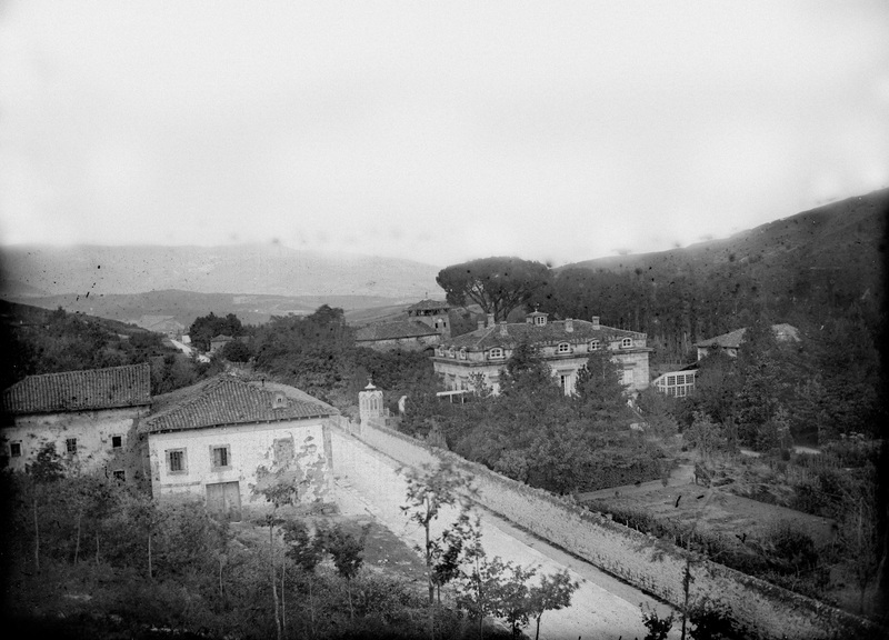 1880 - 1895 Vista general de la localidad de Izurza, donde aparecen a la izquierda , junto al camino el ayuntamiento, a la derecha el palacio Arana, con cerca de piedra, y al fondo el perfil de la iglesia parroquial de San Nicolas.