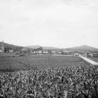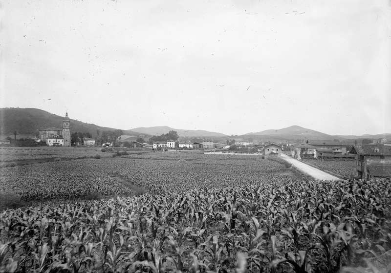 - ES 1880 - 1895 Vista general de Amorebieta, con la carretera a la derecha y la iglesia a la izquierda.