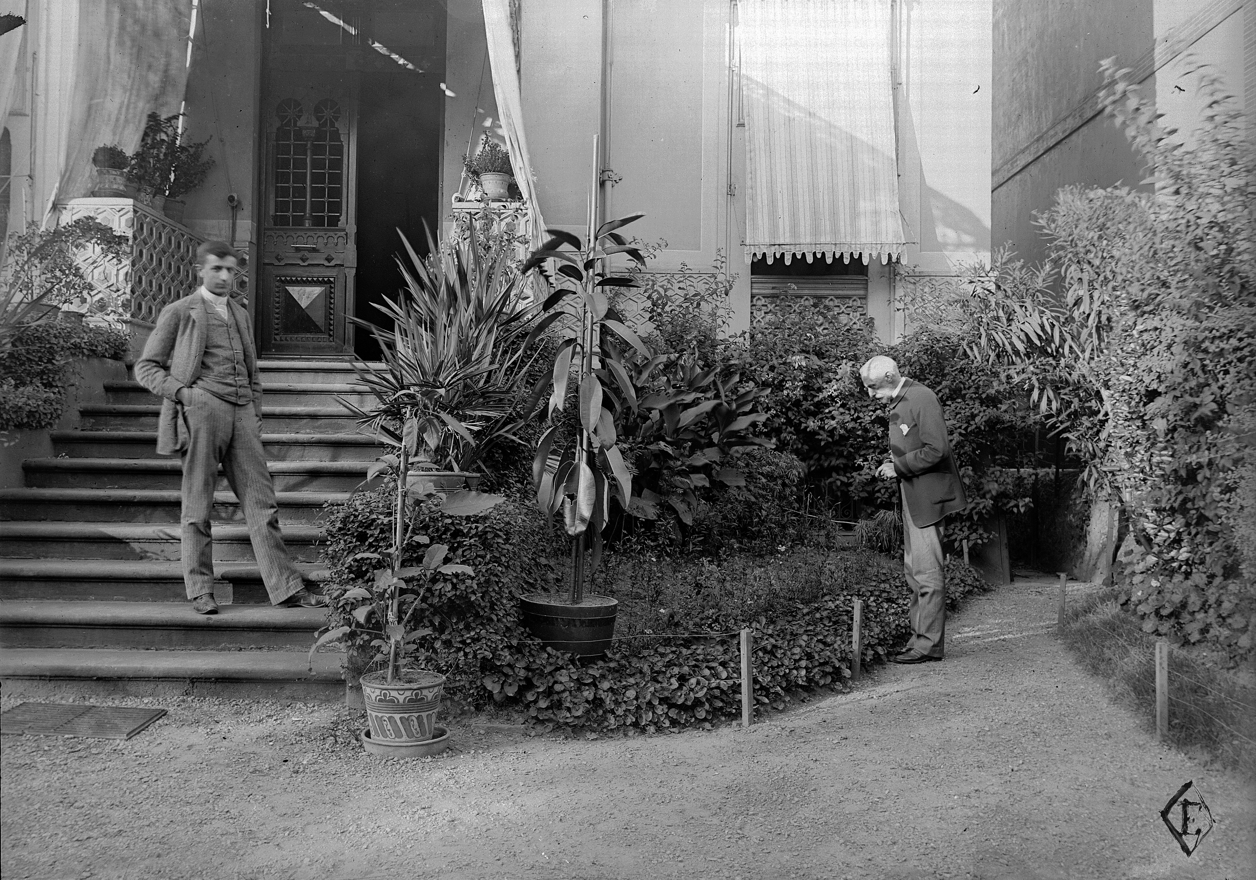1880 - 1895 Tio y sobrino en torno a las escaleras del acceso al chalet nº 37 (actual 34) del Campo Volantín, identificados por Tere Rotaetxe y Begoña Chalbaud: 1- Jose Mª Chalbaud Errazquin, casado con Sofia Olaso. 2- Pedro Telesforo Errazquin, tio de 1. - Segun dossier de UEE (Reg. Entreda nº 2167, 20-04-2006), son los mismos.