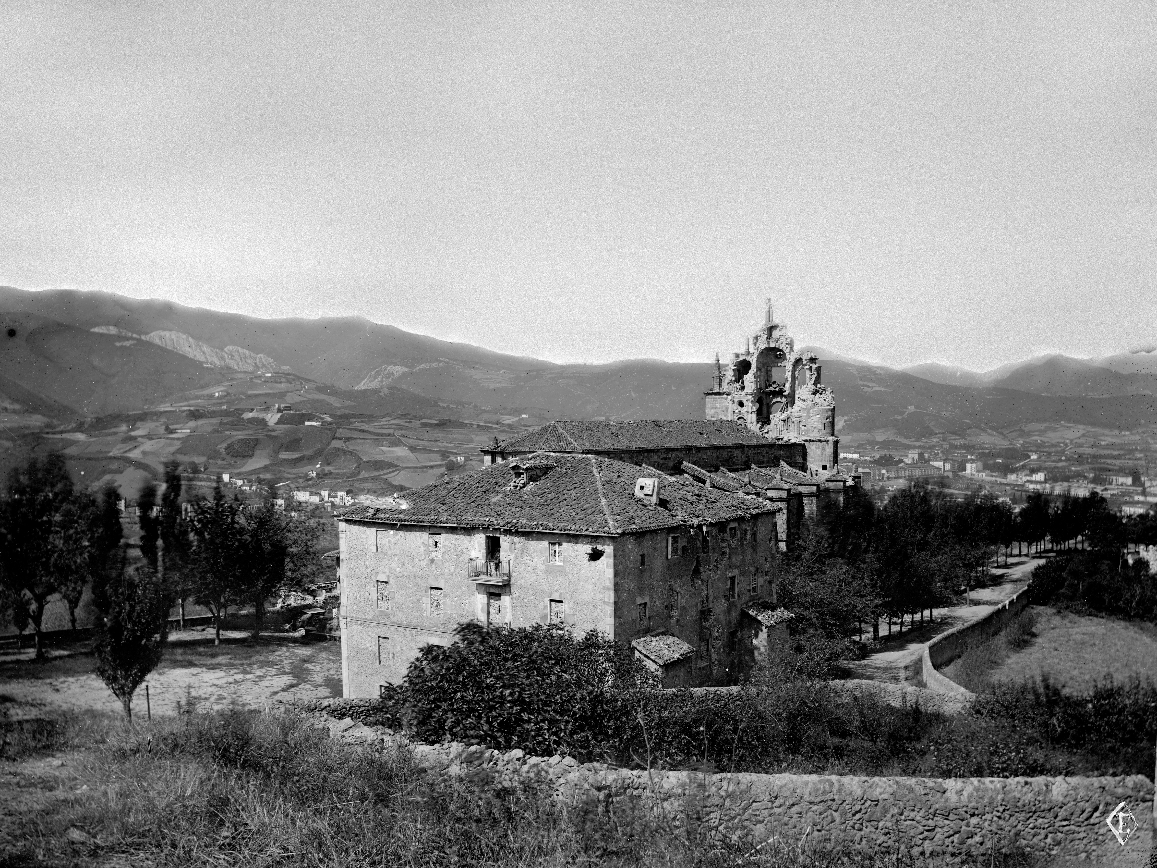 1875 Vista tomada desde el alto de Artagan donde se ve en primer término la casa consistorial de la Anteiglesia de Begoña, conocida como "Casa de la República", obra de Julian Pastor e inaugurada en 1856, perduró con remodelaciones hasta 1957, fecha en que fue demolido para construir los túneles de la Avenida Zumalakarregi, N-634, tras ésta, la iglesia mostrando los destrozos causados durante la II Guerra Carlista. Al fondo, el Casco Viejo.