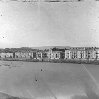 Circa 1890 Vista general tomada desde la margen derecha mostrando la linea del muelle nuevo sobre la cual destacamos la torre de iglesia reconstruida en 1880 al quedar destruida por una granada durante la II Guerra Carlista. A continuación, numeramos las casas: 1. la casa que construyó Manuel Calvo, indiano portugalujo, en 1872 siendo levantada por el arquitecto Francisco de Orueta. A su muerte la cedió al ayuntamiento para hotel y que sus ganancias se destinaran a los pobres. 2. 3. 4. Santo Tomas de Villanueva, construido a expensas de Tomas Jose Epalza Zurbaran que no la vio terminada.
