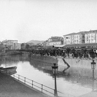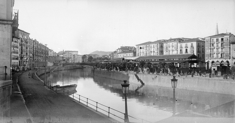 Circa 1891 Desde el muelle de Marzana, en la margen derecha el mercado obra de Julio Sarazibar, inaugurado en 1882, con pabellones realizados en Santa Ana de Bolueta. El puente colgante de San Francisco se ha sustituido por el de hierro del ingeniero Pablo de Alzola, inaugurado en 1881 y, tras éste ya está el puente de La Merced, de Ernesto Hoffmeyer, inaugurado en 1891. Ambas márgenes de la ría ya están perfectamente construidas y se obrseva la nueva torre de Santiago. Es panorámica P008 con ERR-316 por la izquierda. Esta imagen ha sido reproducida en el calendario 2020, en portada, editado por la Autoridad Portuaria de Bilbao /Bilboko Portuko Agintaritza en colaboración con el Museo.