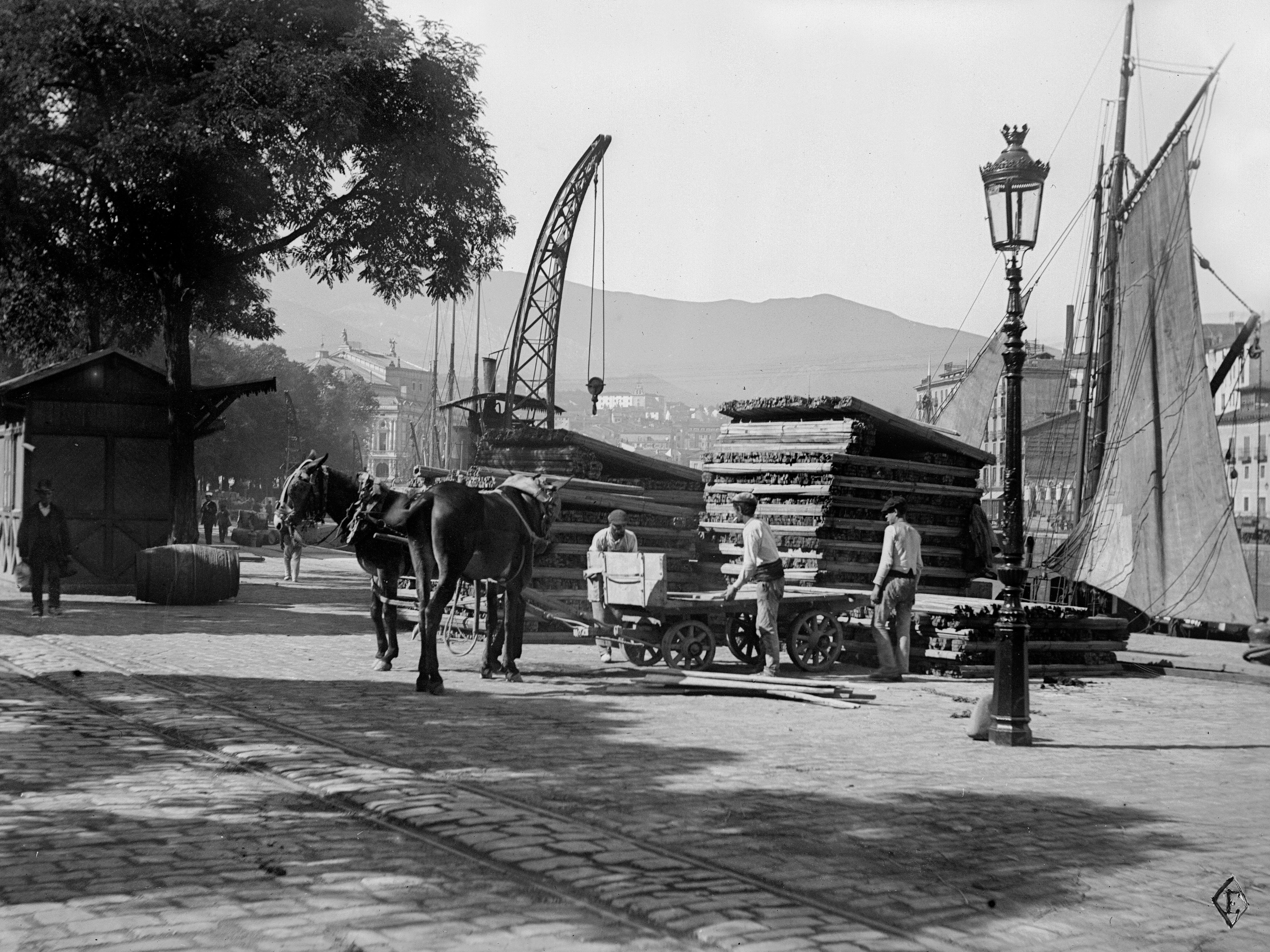Circa 1891 Vista del muelle del Arenal mostrando la actividad portuaria y una grua a vapor. Las obras del encauzamiento de la mitad superior de la ría, finalizadas para 1889, permitieron que la carga y descarga "general" se trasladara de Olabeaga al centro de la villa. Al fondo el teatro nuevo se vislumbra entre los árboles y apreciamos los railes del tranvía urbano. Esta imagen ha sido reproducida en el calendario 2020, en el mes de marzo, editado por la Autoridad Portuaria de Bilbao /Bilboko Portuko Agintaritza en colaboración con el Museo.