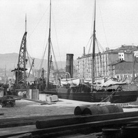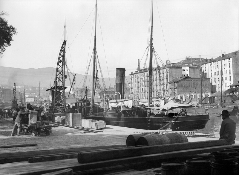 c. 1891 Vista tomada desde el muelle hacia el puente del Arenal donde aparece un barco de vapor amarrado junto a una de las gruas de carga y descarga.