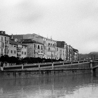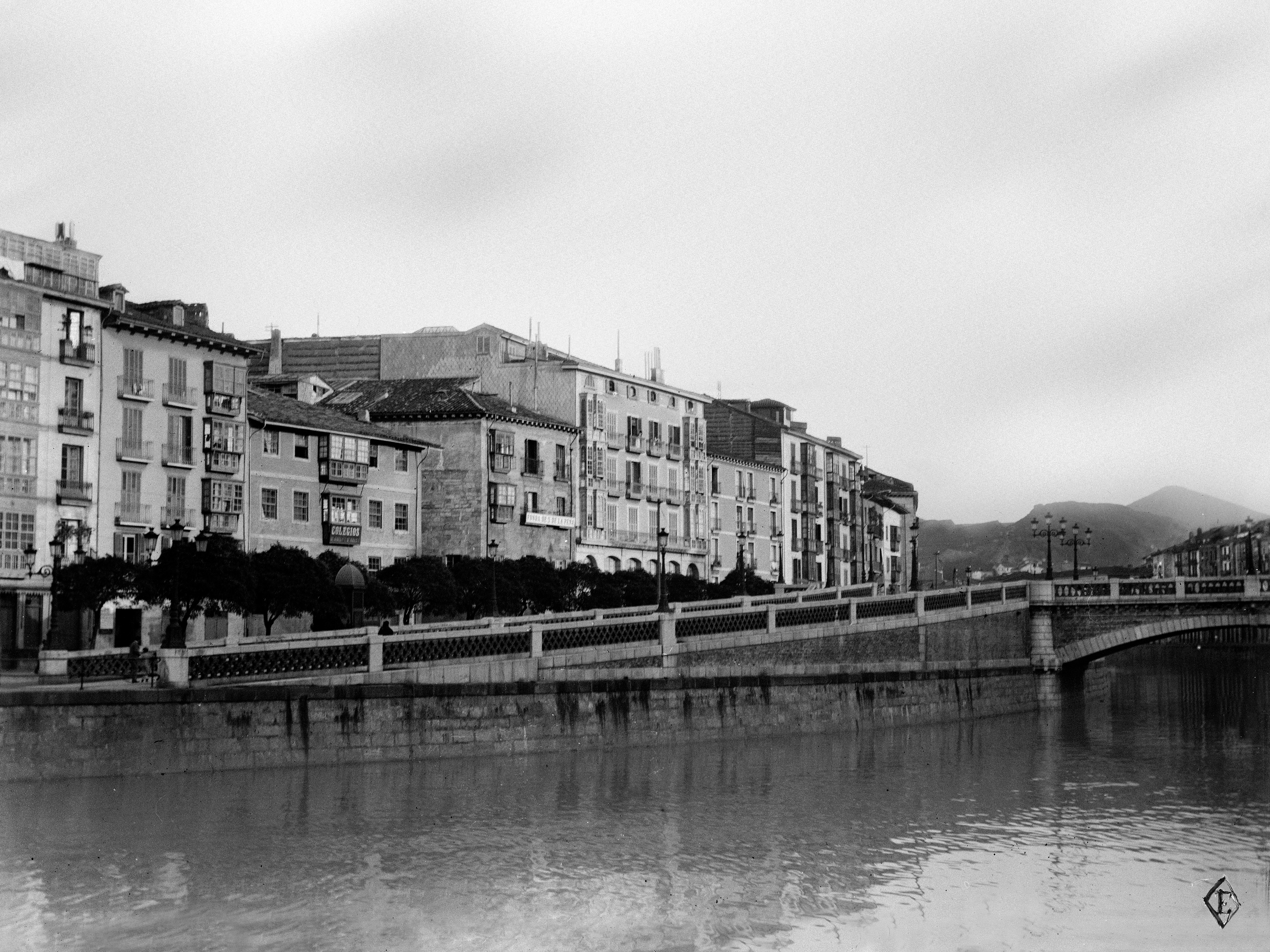 c. 1892 Vista tomada desde el muelle de La Naja mostrando el arbolado y casas de la calle La Ribera a la altura del puente de La Merced, del que observamos parte de su arquitectura de piedra y ladrillo, obra del ingeniero Ernesto Hoffmeyer, inaugurado en 1891.