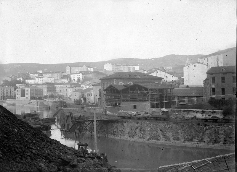 Circa 1891 Vista tomada desde el embardadero de la mina de San Luis mostrando parte de las instalaciones de la estación de ferrocarril de Durango y a la izquierda las escuelas viejas de Atxuri, el hospital y en Solokoetxe, la casa de Expósitos y la cárcel de Larrinaga. - En dossier de UEE (Reg. Entrada 2167, 20-04-2006).