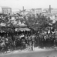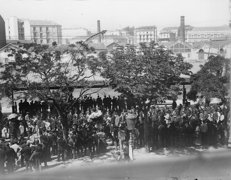 1892 Vista tomada desde un balcón de un inmueble de la calle Sendeja donde nos aparece los preliminares de un desfile que no identificamos exactamente, pudiendo tratarse quizá del ocurrido con motivo de la inauguración de la nueva casa consistorial en 1892.