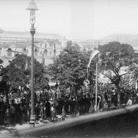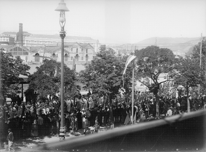 1892 Vista tomada desde un balcón de un inmueble de la calle Sendeja donde nos aparece un desfile que no identificamos exactamente, pudiendo tratarse quizá del ocurrido con motivo de la inauguración de la nueva casa consistorial en 1892.
