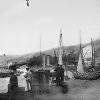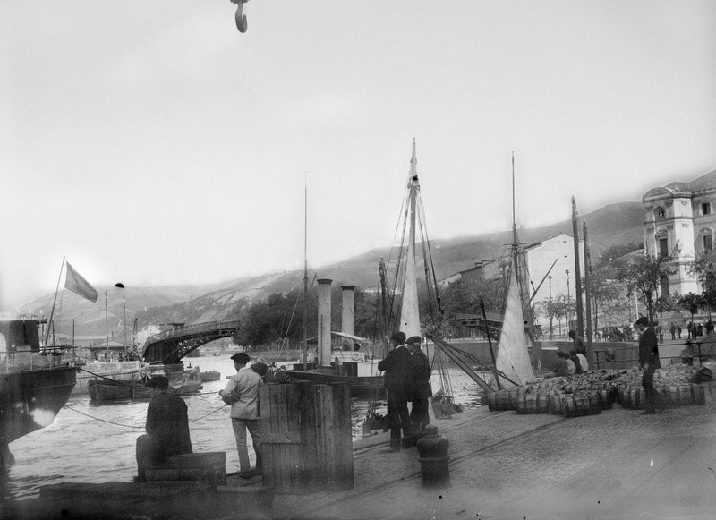 c. 1893 Vista del muelle de La Sendeja con mercancías diversas y al fondo se aprecia el puente giratorio del ayuntamiento abierto, este puente era conocido como "puente del perro chico", haciendo alusión al peaje del mismo, obra del ingeniero Brahon, fue construido en los Talleres de Zorroza e inaugurado a finales de 1892 por lo que quedaban unidas la calle de la Sierra, hoy Buenos Aires, y el ayuntamiento.