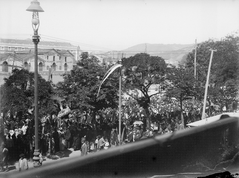1892ko maiatzaren 2a. El Sitio Elkarteak antolatutako prozesio zibikoa. Udaletxetik abiatzen zen, eta Sendeja kaletik Bidebarrietara iristen zen, eta kale horretatik bira egiten zuen Auxiliar Plazara (egun Unamuno) iritsi eta Mallonako eskailerak igotzeko. Sendeja kaleko eraikin bateko balkoi batetik hartutako bista, non lore-korro bat ikus daitekeen. Lore-koroaren atzean, gizon bat, kapela bat duena, Sociedad el Sitiorena izan daitekeen bandera batekin. Jarraian, musika banda militarra.