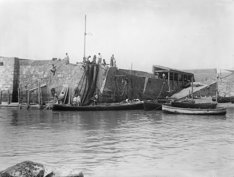 - ES 1885-1895 Vista parcial del puerto viejo de Algorta donde se aprecia un grupo de hombres manipulando redes y barcos amarrados.
